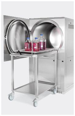 可采用特制載物車將樣品安全方便的放入大體積滅菌柜,裝載推車上的平臺可以放置滅菌筐或者待滅菌物品,當(dāng)車將臺面樣品送入時,松開鎖緊夾具,滅菌物品或者筐可以很輕松的被推入滅菌器內(nèi)部。